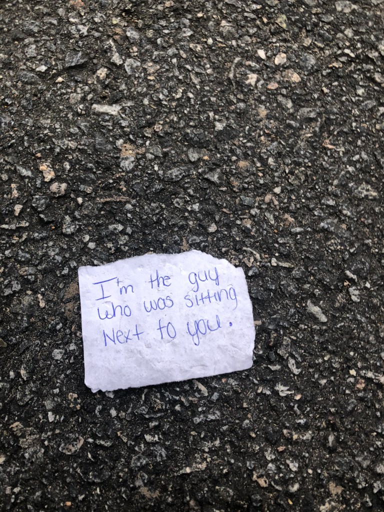 “I’m the guy who was sitting next to you.” Isn’t that interesting? I guess whoever was sitting next to him wasn’t as pleased with that as he expected, since they left this laying on the ground. Of course they could have dropped it accidentally? Or – hell, I dunno, maybe it was a blackmail note. Does it have a sinister ring to it? So many possibilities – actually, it sounds like the beginning of a ‘nilla story, doesn’t it? But we’ll never know…