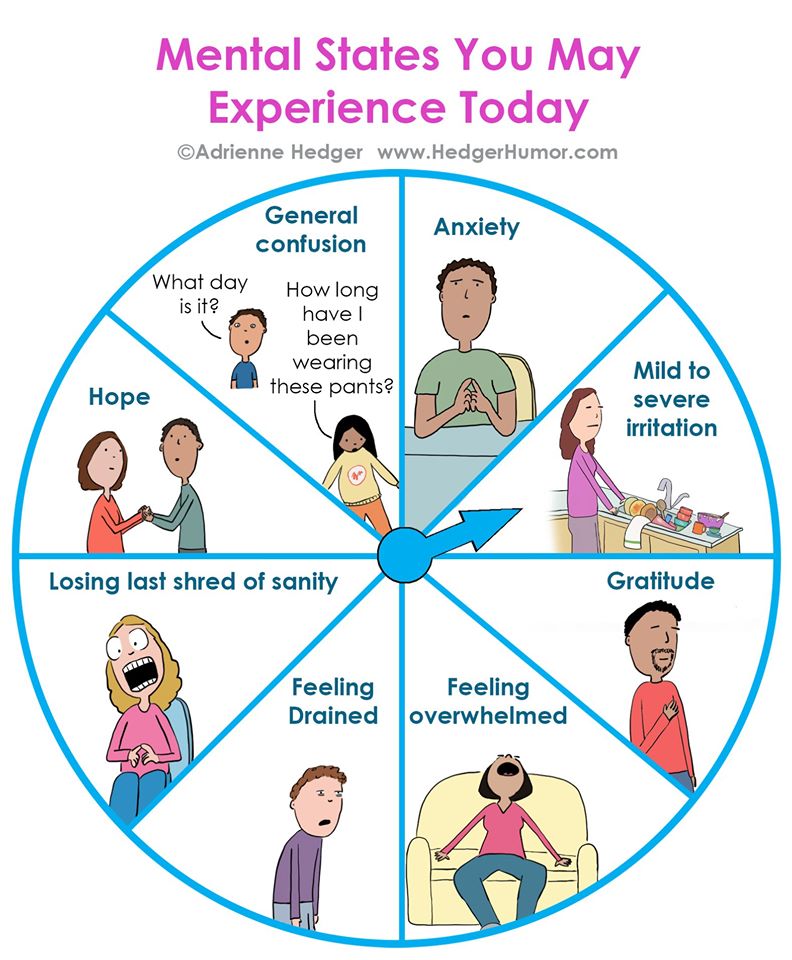 (If you can’t see the graphic, it’s like a clock, portioned out into segments, titled “Mental States You Might Experience Today.” Each state has a little drawing with a person that illustrates that states. The feelings are: General Confusion, Anxiety, Mild to severe irritation, Gratitude, Overwhelmed, Drained, Losing last shred of sanity, and Hope.)