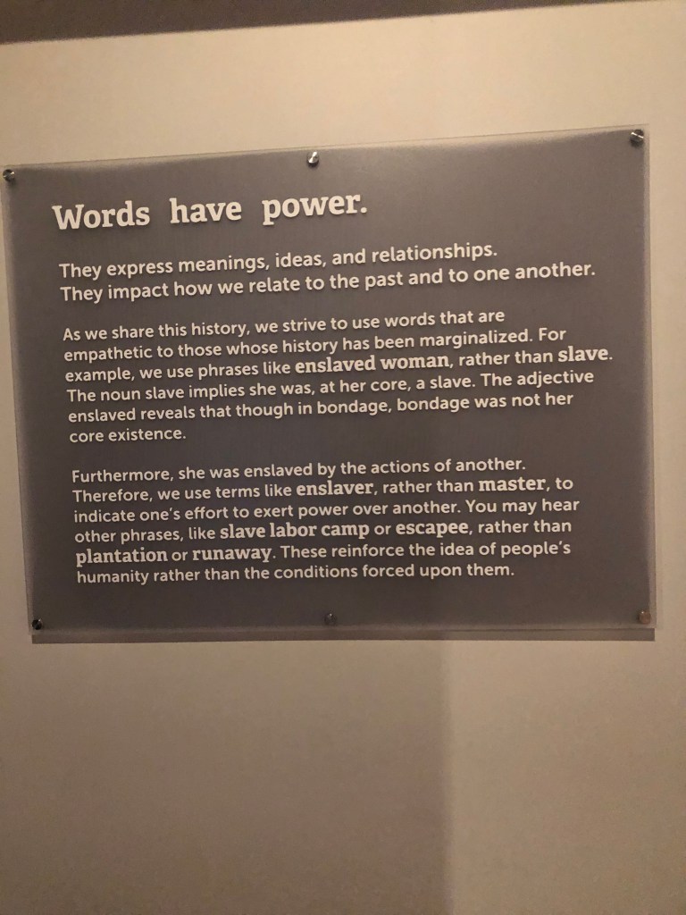 As we share this history, we strive to use words that are empathetic to those whose history has been marginalized. For example, we use phrases like enslaved woman, rather than slave. The noun slave implies that she was, at her core, a slave. The adjective enslaved reveals that though in bondage, bondage was not her core existence.