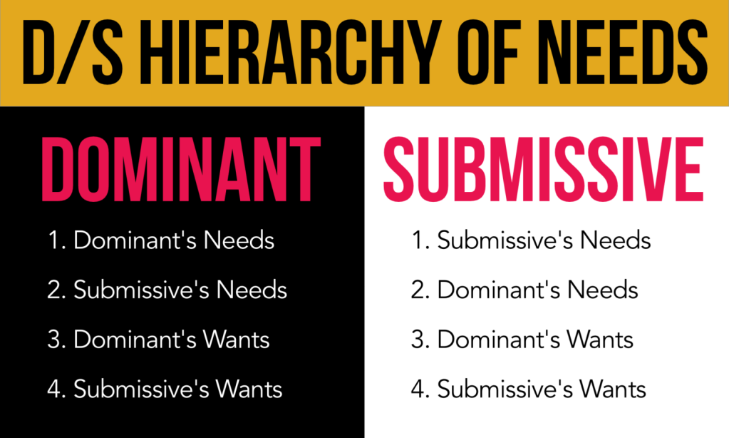 It has this hierarchical list: Sub’s needs/ Dom’s needs/ Dom’s wants/ Sub’s wants. That’s how I’ve thought of it, what I’ve been taught in my submissive experience.